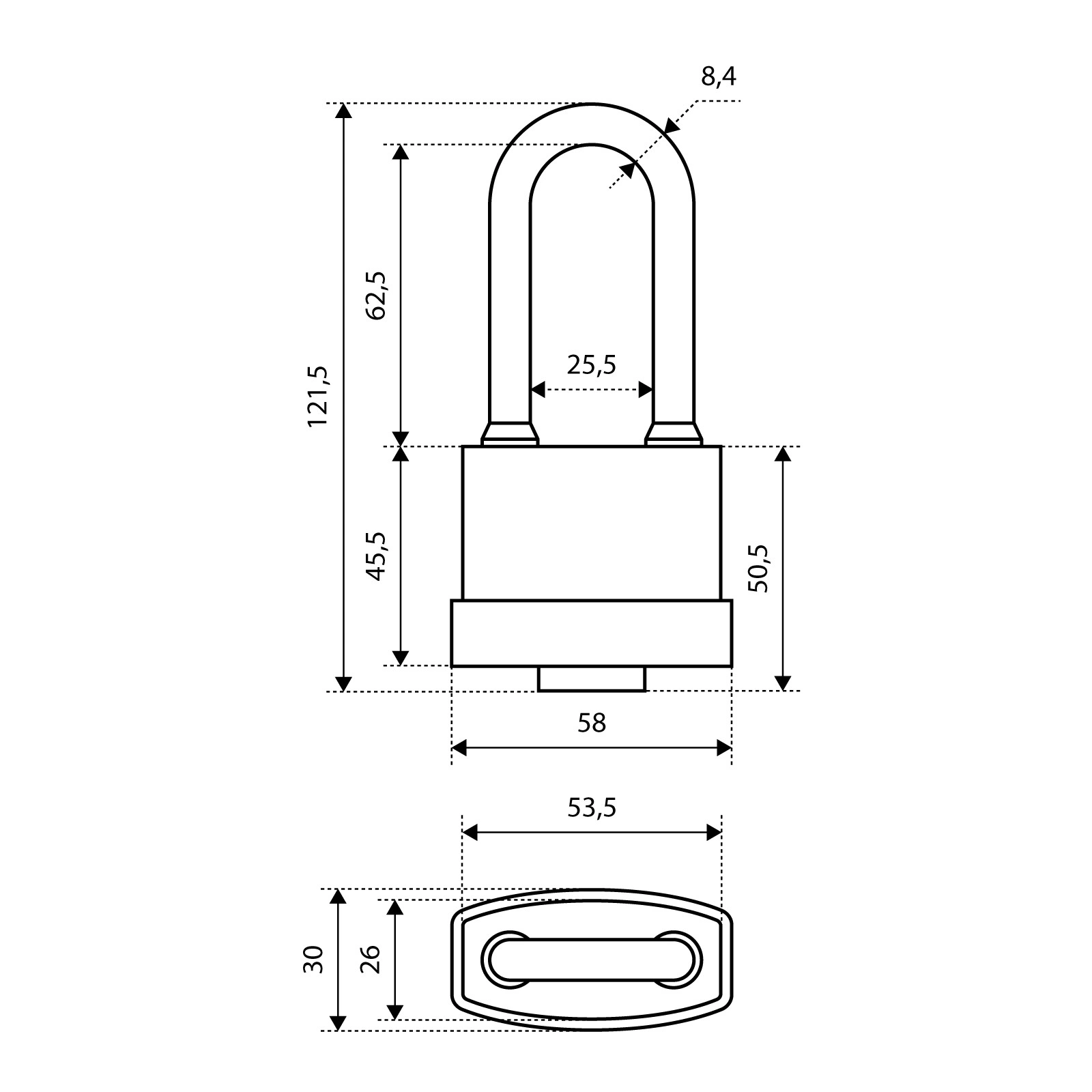 Размеры корпуса - 58ммх47мм, диаметр дужки - 8,5мм.