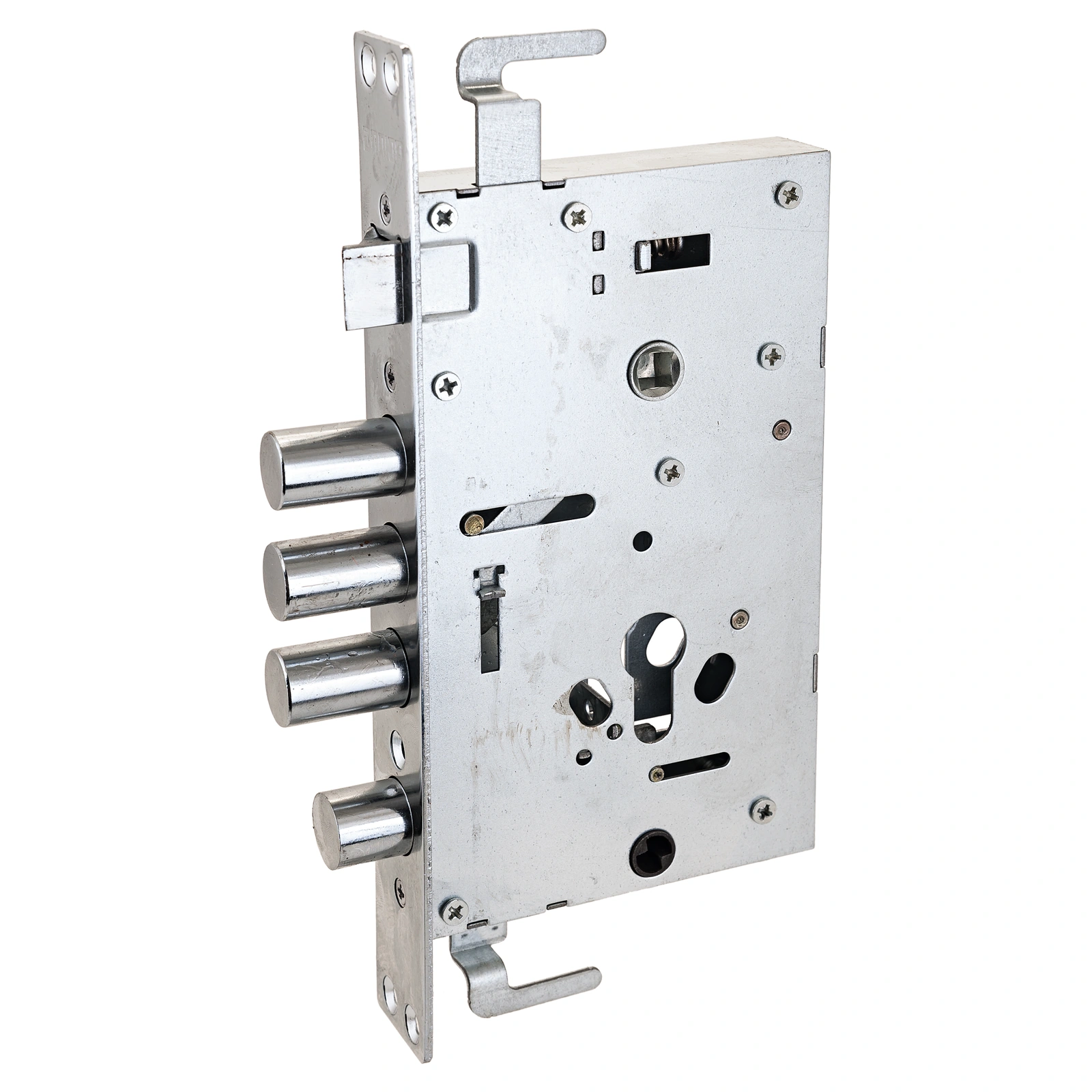 Засов из трех стальных цилиндрических ригелей, диаметром 18 мм, с максимальным вылетом 30 мм. Оцинкованный стальной корпус.