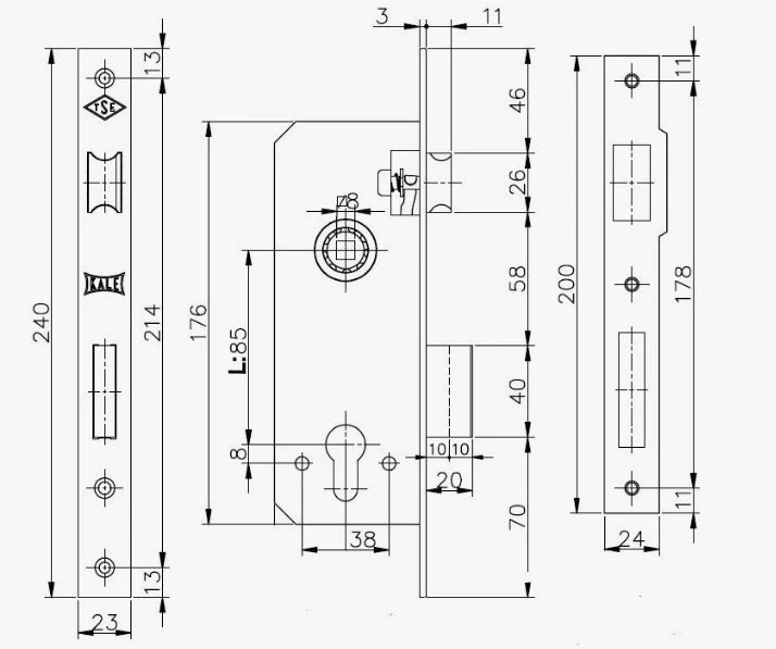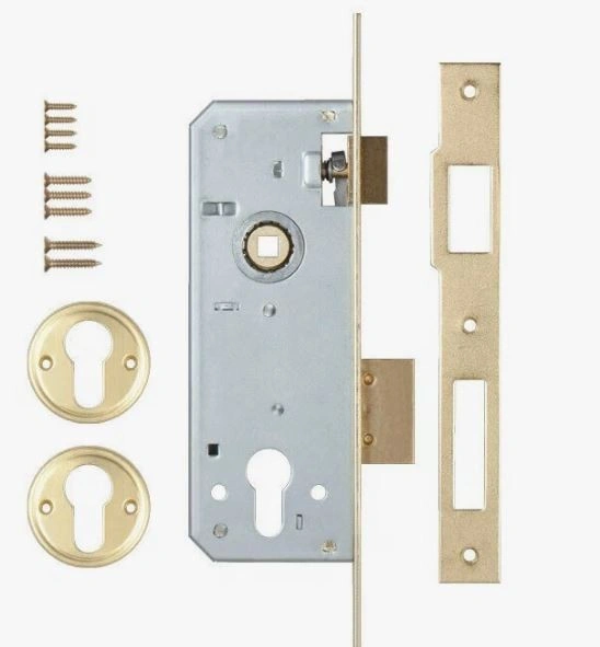 Прямой ригель. Вылет ригеля 20мм. Удаление ключевого отверстия 40мм. Межосевое расстояние 85мм. Цвет торцевой планки - латунь, ширина 23мм.