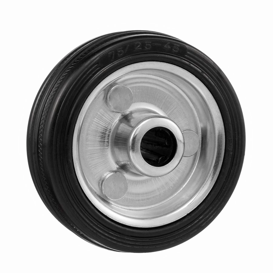 Колесо под ось 12 мм. 4000-75, диаметр 75мм., грузоподъемность 50кг., Колесо из черной литой резины. Центр из стального оцинкованного обода из штампованной стали. В оси колес роликовый подшипник. Колеса из черной резины, центр из двух гальванизированных дисков из штампованной стали. Роликовый (игольчатый) подшипник расположен в углублении, выдавленном под прессом, и содержит цилиндрические ролики подшипника. Возможно применение на относительно грубых полах складов, заводов, производственных и строительных площадках. Данные колеса можно использовать на неровных поверхностях, во влажной окружающей среде и использовании вне помещения, не рекомендуется применять в среде с органическими растворителями, хлорированными веществами, гидрокарбонатами и минеральными маслами. Температура эксплуатации от -20 до +70С.