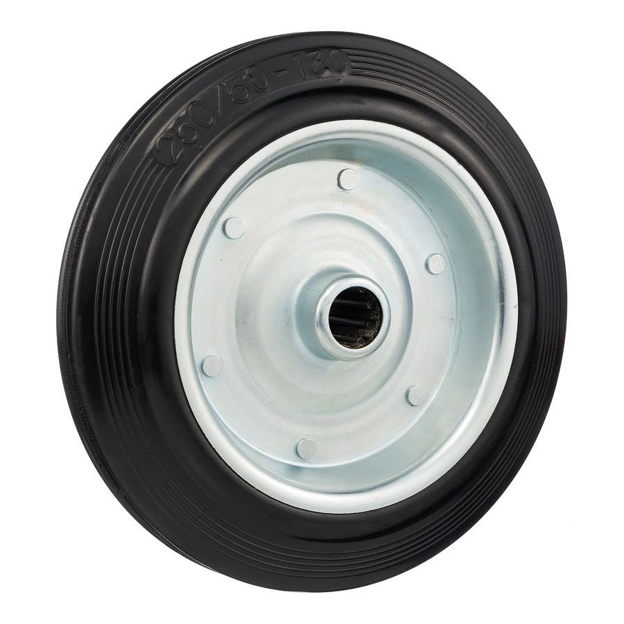 Колесо под ось 20 мм. 4000-250, диаметр 250мм., грузоподъемность 210кг., резина, металл. Колесо из черной литой резины. Центр из стального оцинкованного обода из штампованной стали. В оси колес роликовый подшипник. Колеса из черной резины, центр из двух гальванизированных дисков из штампованной стали. Роликовый (игольчатый) подшипник расположен в углублении, выдавленном под прессом, и содержит цилиндрические ролики подшипника. Возможно применение на относительно грубых полах складов, заводов, производственных и строительных площадках. Данные колеса можно использовать на неровных поверхностях, во влажной окружающей среде и использовании вне помещения, не рекомендуется применять в среде с органическими растворителями, хлорированными веществами, гидрокарбонатами и минеральными маслами. Температура эксплуатации от -20 до +70С.