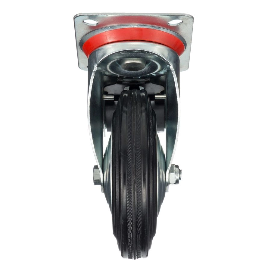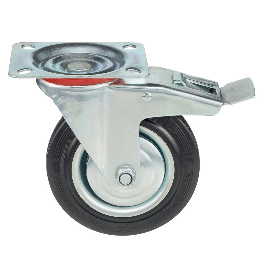 Колесо поворотное с тормозом 4003-160, диаметр 160мм., грузоподъемность 145кг. Колеса из черной литой резины, центр из двух гальванизированных дисков из штампованной стали. Роликовый (игольчатый) подшипник расположен в углублении, выдавленном под прессом, и содержит цилиндрические ролики подшипника. Кронштейн изготовлен прессованием из листовой стали. В поворотном узле двухрядный шарикоподшипник. Кронштейн оснащен тормозом, блокирующим вращение колеса и вилки, относительно площадки крепления. Возможно применение на относительно грубых полах складов, заводов, производственных и строительных площадках. Данные колеса можно использовать на неровных поверхностях, во влажной окружающей среде и использовании вне помещения, не рекомендуется применять в среде с органическими растворителями, хлорированными веществами, гидрокарбонатами и минеральными маслами. Температура эксплуатации от -20 до +70С.