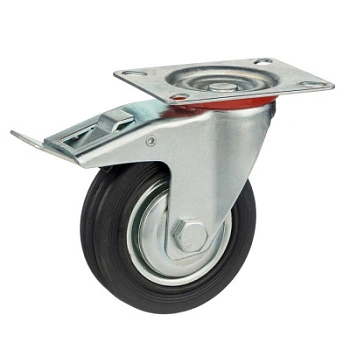 Колесо поворотное с тормозом 4003-75, диаметр 75мм., грузоподъемность 50кг. Колеса из черной литой резины, центр из двух гальванизированных дисков из штампованной стали. Роликовый (игольчатый) подшипник расположен в углублении, выдавленном под прессом, и содержит цилиндрические ролики подшипника. Кронштейн изготовлен прессованием из листовой стали. В поворотном узле двухрядный шарикоподшипник. Кронштейн оснащен тормозом, блокирующим вращение колеса и вилки, относительно площадки крепления. Возможно применение на относительно грубых полах складов, заводов, производственных и строительных площадках. Данные колеса можно использовать на неровных поверхностях, во влажной окружающей среде и использовании вне помещения, не рекомендуется применять в среде с органическими растворителями, хлорированными веществами, гидрокарбонатами и минеральными маслами. Температура эксплуатации от -20 до +70С.