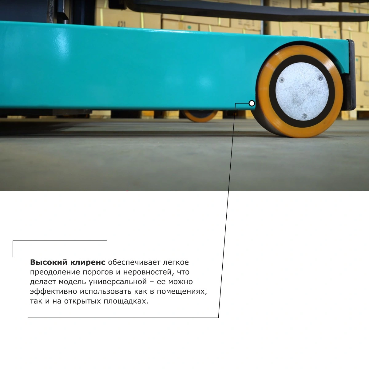 - Высокий клиренс обеспечивает легкое преодоление порогов и неровностей, что делает модель универсальной – ее можно эффективно использовать как в помещениях, так и на открытых площадках.
