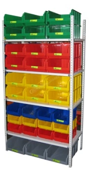 Полочный стеллаж с ударопрочными ящиками типа V подойдет для хранения инструмента, деталей, запчастей или различных мелочей. Стеллаж идет в комплекте с ударостойкими пластиковыми ящиками серии "V" из полипропилена. Цвета ящиков можно указать в заказе. Дополнительно можно установить 3 ящика на пол (в стоимость не входят и продаются отдельно).