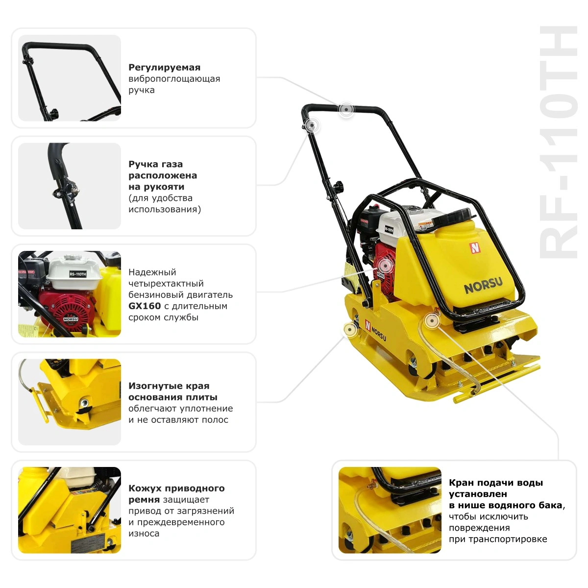 Прямоходная виброплита RF-110TH бренда NORSU подходит для уплотнения песчаных и гравийных оснований, укладки асфальта, выравнивания брусчатки, выполнения ремонта дорожных покрытий. Глубина уплотнения равна 300 мм. Топливный бак рассчитан на объем 3.6 л. Встроенные колеса позволяют выполнять быстрое перемещение плиты между рабочими участками. Техника малогабаритная, может использоваться в местах, где нет доступа более крупным аналогам. Область применения: благоустройство территорий, прокладка инженерных коммуникаций, выполнение дорожных работ.