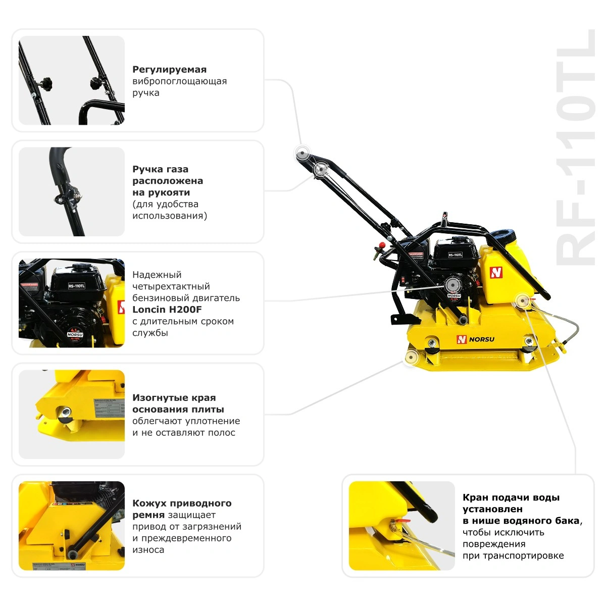 Прямоходная виброплита RF-110TL бренда NORSU подходит для уплотнения песчаных и гравийных оснований, укладки асфальта, выравнивания брусчатки, выполнения ремонта дорожных покрытий. Глубина уплотнения равна 300 мм. Топливный бак рассчитан на объем 2.5 л. Встроенные колеса позволяют выполнять быстрое перемещение плиты между рабочими участками. Техника малогабаритная, может использоваться в местах, где нет доступа более крупным аналогам. Область применения: благоустройство территорий, прокладка инженерных коммуникаций, выполнение дорожных работ.