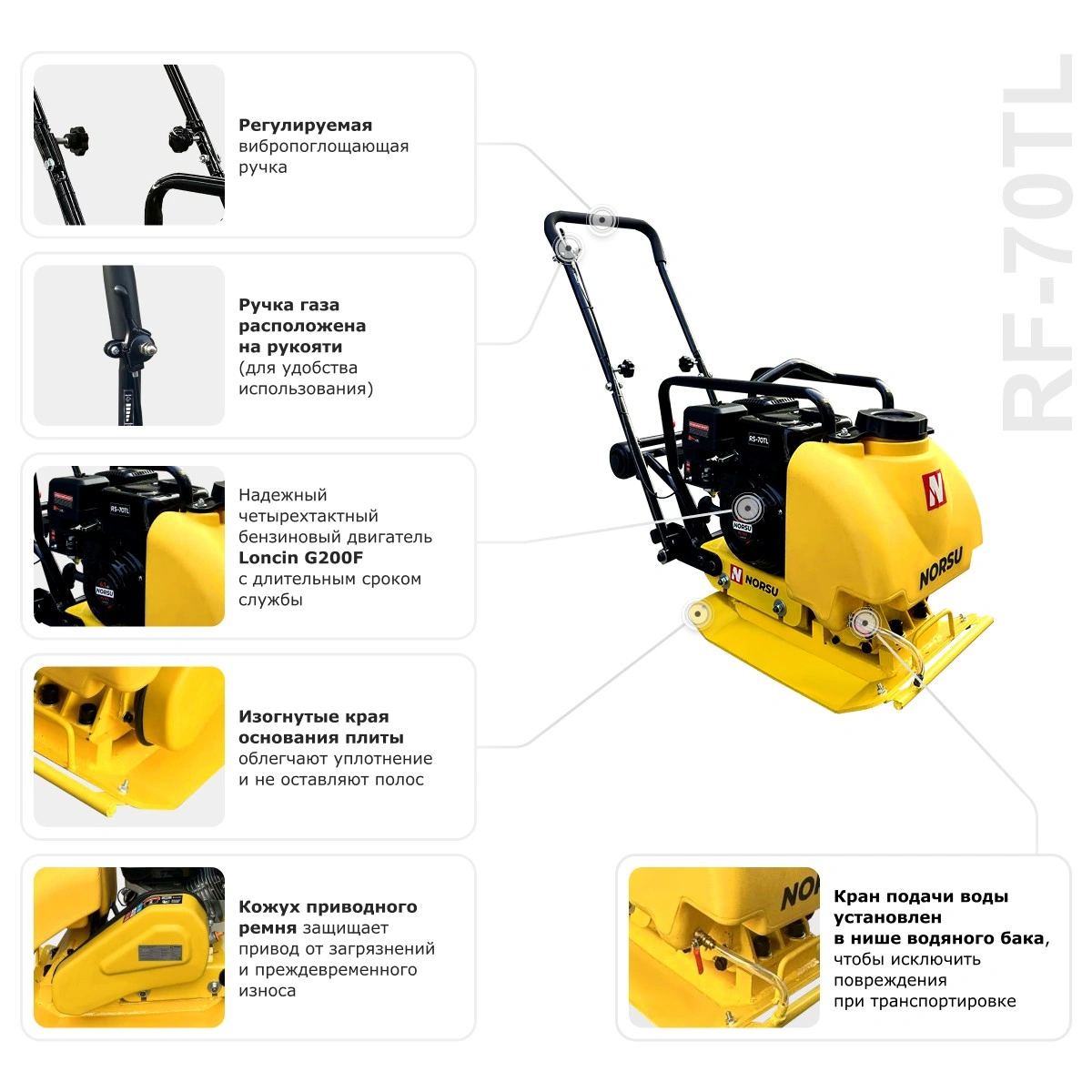 Виброплита NORSU RF-70TL служит для уплотнения грунтов на глубину до 200 мм. Кроме того, модель подходит для заглаживания бетонных поверхностей, укладки тротуарной плитки и асфальта. Топливный бак имеет объем 2.5 л. Преимуществом является наличие колесного комплекта. Складная ручка обеспечивает удобство транспортировки и хранения. Благодаря компактным размерам виброплита может использоваться в ограниченном пространстве (вдоль стен или фундаментов, в траншеях).