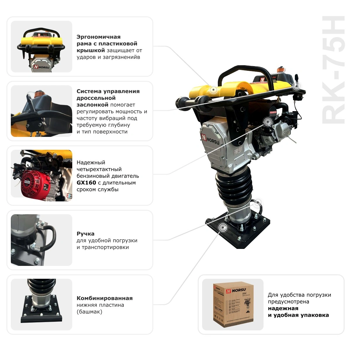 Вибротрамбовка NORSU RK-75H — это бензиновая модель с объемом топливного бака 2.8 л. Используется для уплотнения грунтов на глубину до 150 мм. Востребована при проведении дорожных работ, устройстве фундаментов, уплотнении краев тротуаров, пространства вокруг люков, при прокладке коммуникаций и создании ландшафтных композиций. Оборудована надежным двигателем NORSU GX160.